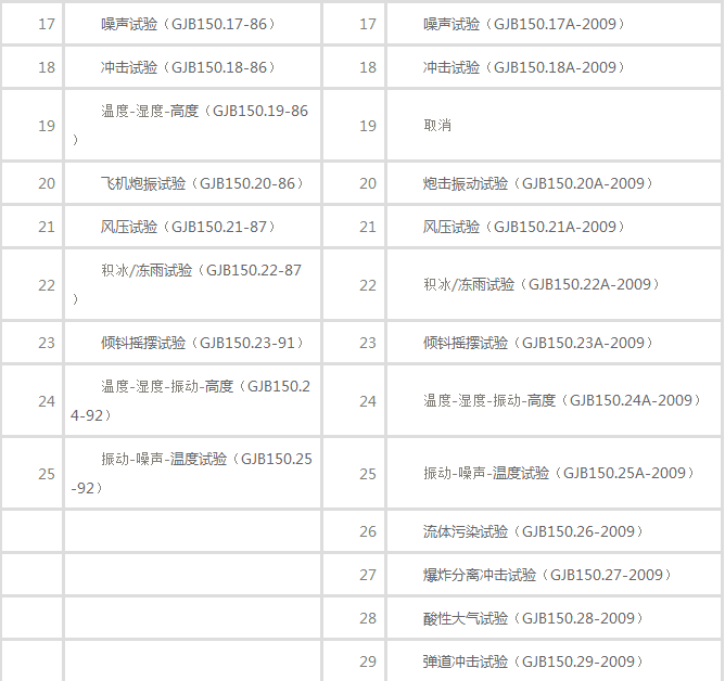 GJB 150A包含28個部分,前23個部分是對GJB 150全部25個規(guī)范的修訂。在修訂過程中刪除了GJB 150中的第6部分《軍用設(shè)備環(huán)境試驗方法-溫度-高度試驗》(GJB150.6-86)和第19部分《軍用設(shè)備環(huán)境試驗方法-溫度/濕度/高度試驗》(GJB 150.19-86)。因此,修訂后的GJB 150內(nèi)容由25個部分變成了23個部分,每個部分的標準編號由GJB 150.XX-XX變?yōu)镚JB 150.XXA-2009。GJB 150A的后5個部分,是新增加的內(nèi)容,分別是《軍用裝備實驗室環(huán)境試驗方法-流體污染試驗》、《軍用裝備實驗室環(huán)境試驗方法-爆炸分離沖擊試驗》、《軍用裝備實驗室環(huán)境試驗方法-酸性大氣試驗》、《軍用裝備實驗室環(huán)境試驗方法-彈道沖擊試驗》和《軍用裝備實驗室環(huán)境試驗方法-艦船沖擊試驗》,標準編號分別為GJB 150.26-2009、GJB 150.27-2009、GJB 150.28-2009、GJB 150.29-2009,由于這些內(nèi)容是新增加的、未經(jīng)修訂,因此在標準編號仍然為GJB150.XX-2009,而不是GJB 150.XXA-2009。GJB 150與GJB150A的內(nèi)容對比如表所示。